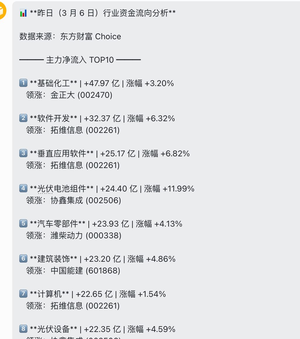 “帮我分析下 昨日 行业资金流向。”