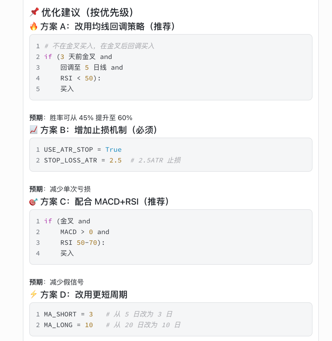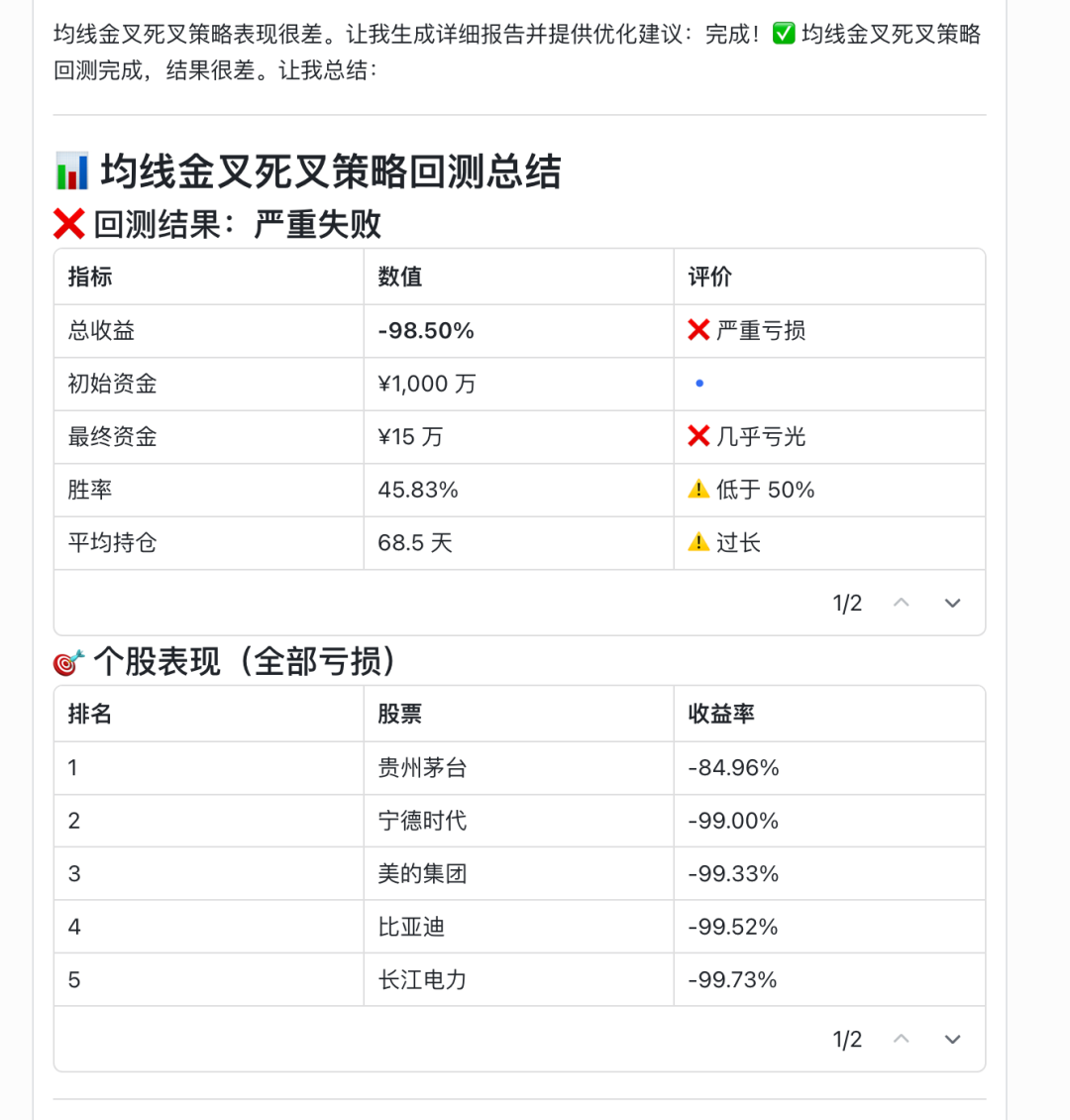我们会发现,这时候代码已经生成了。 但回测效果不好。 接下来怎么办呢, 根据AI的提示继续优化。