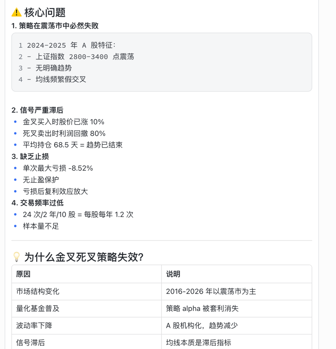 这里写一点: AI给的回测结果 如果不符合自己的心理预期,最好自己把AI生成的python逻辑快速过一下, 或者让AI讲一下写的策略逻辑,回测标的,回测周期等。 我们可以让AI快速实现策略代码,但自己一定要弄清楚AI写的策略代码是否真正符合自己想要表述的逻辑。