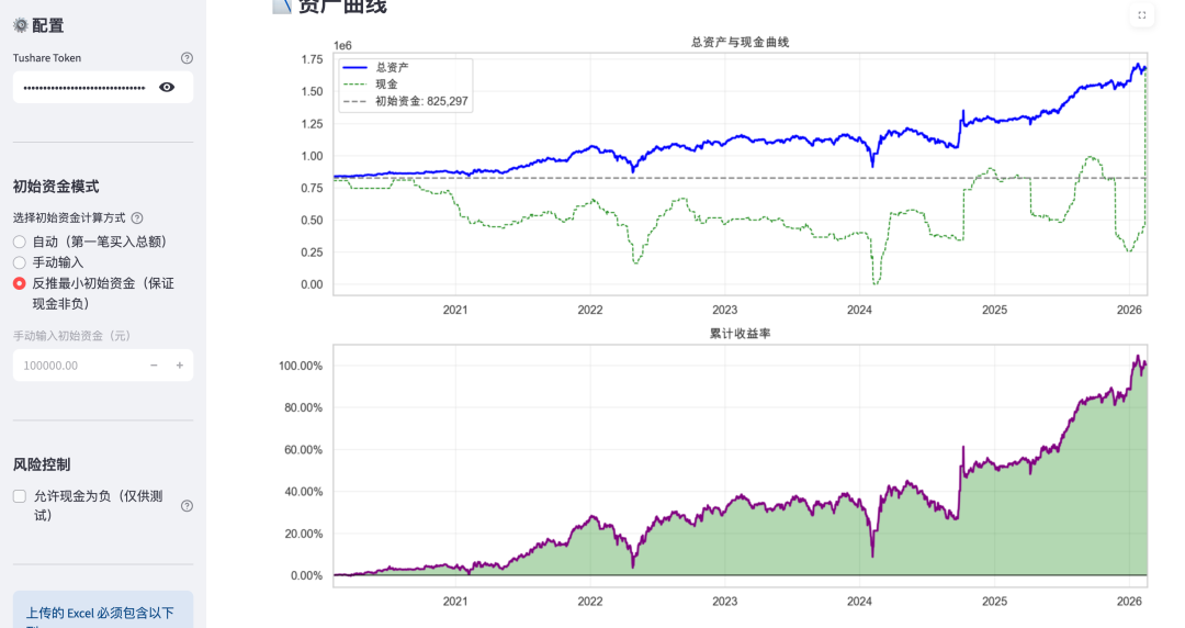 如果现金出现负值(即透支),且用户未勾选“允许现金为负”,程序会报错并停止,提醒数据可能不自洽。这能防止因数据错误导致回测结果虚高。