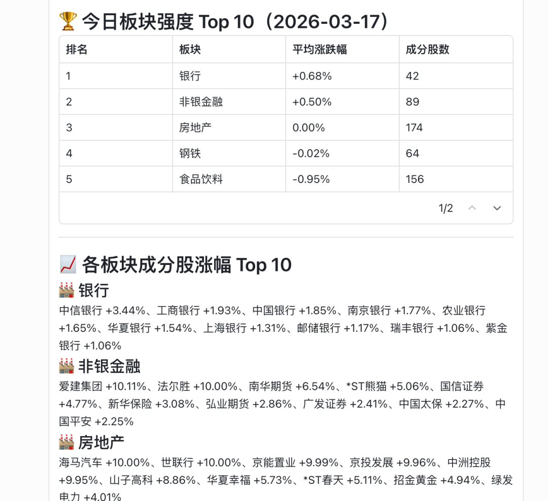 最近在给openclaw小龙虾写一些自用的skill,看了下东方财富、新浪、同花顺、tushare、qmt网上都有对应的skill,比如akshare-stock、stock-watcher等。 那要不写个不一样的把, 就以开盘啦为例,把之前的开盘啦板块相关代码封装成板块成分股skill。 比如每隔5分钟在飞书里输出板块强度前10以及对应的板块成分股,方便了解大盘板块行情变化。