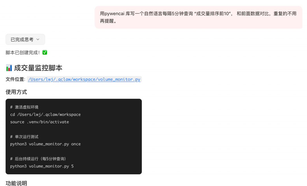 那么这样就完成 股票异动数据 通过同花顺Pywencai监控了。 虽然pywencai依赖Node, 而openclaw安装前准备已经安装了node ,就可以直接使用了。