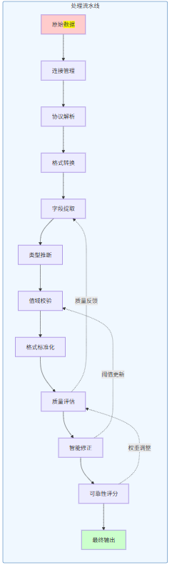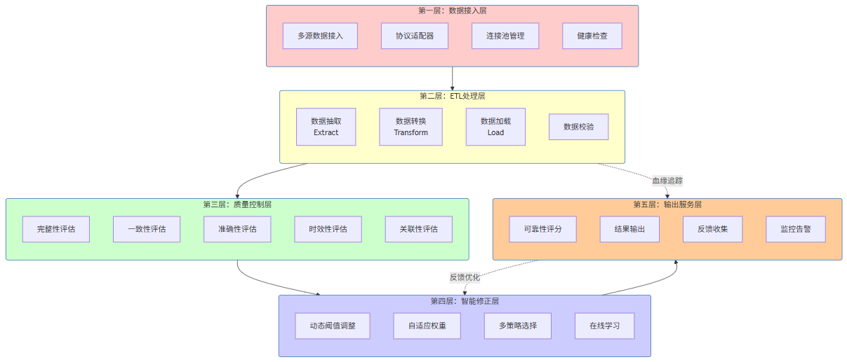 AI字段降噪完整解决方案采用五层架构设计,自下而上分别为:数据接入层、ETL处理层、质量控制层、智能修正层、输出服务层。这种分层设计确保了各模块的职责单一性和可替换性,同时通过标准化的接口实现层间解耦。