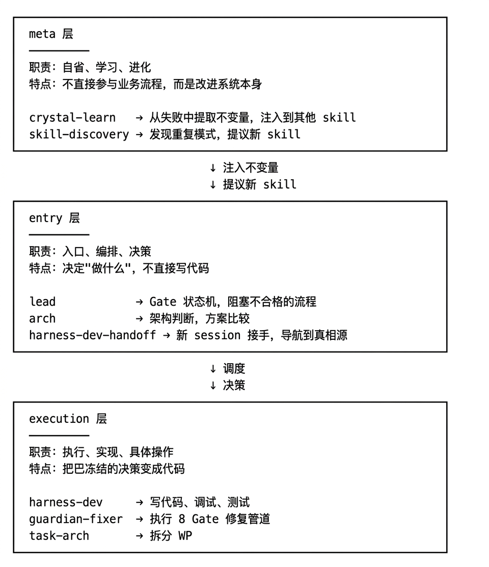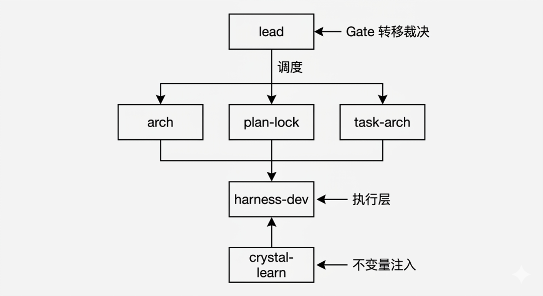 lead 只判断 Gate 转移,不写代码harness-dev 只执行已冻结的计划,不做架构决策# crystal-learn 的定位