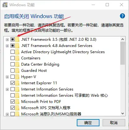 如果是Win10系统,.NET Framework 3.5 需要在“启用或关闭 Windows 功能”勾选安装。