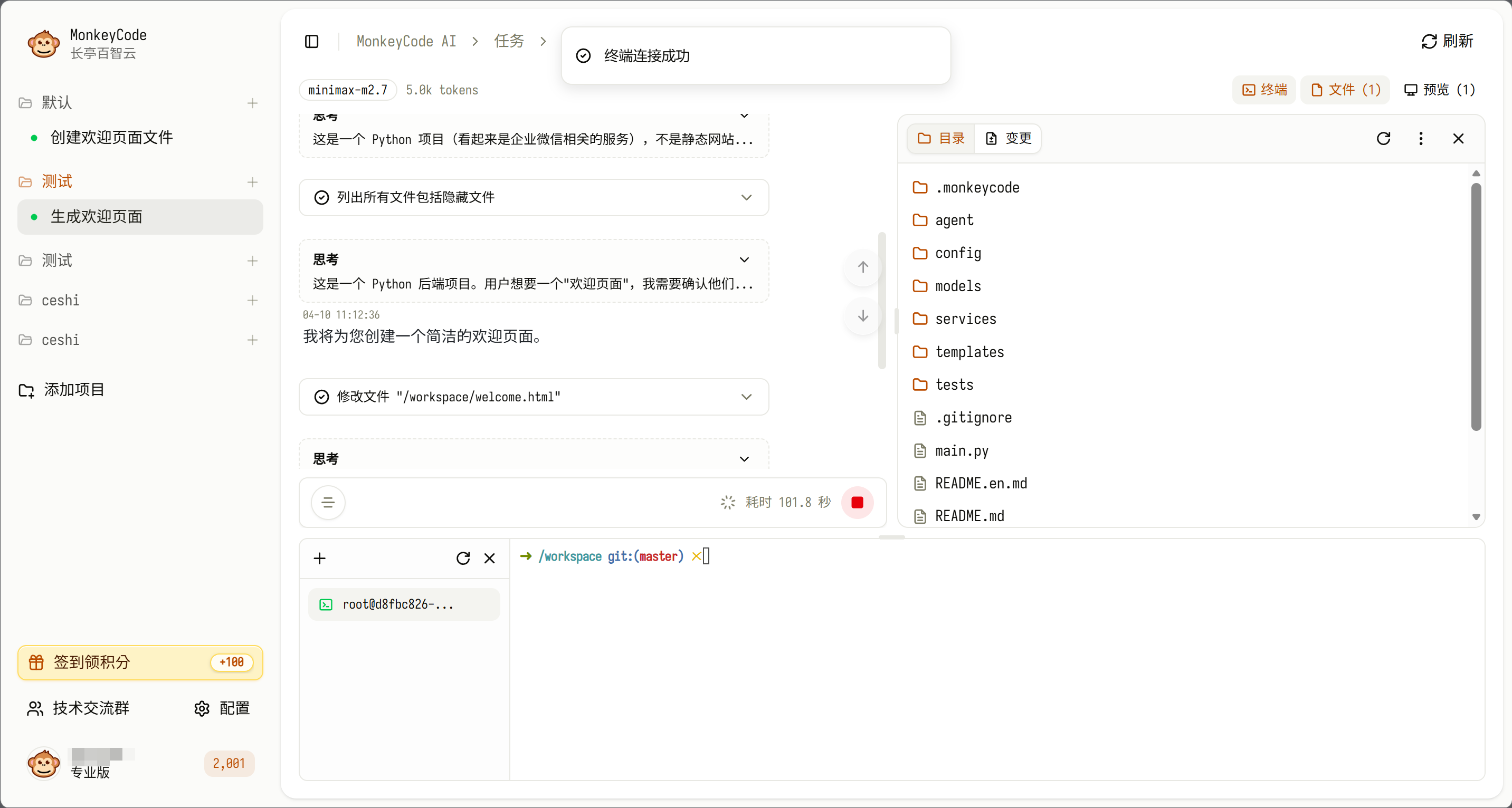 使用心得:出差的时候,不用背着厚重的游戏本,只要手机或平板能访问MonkeyCode网页,就能随时改代码、跑终端命令、查看日志,应急处理Bug特别方便,真正实现了“随时随地在线研发”。