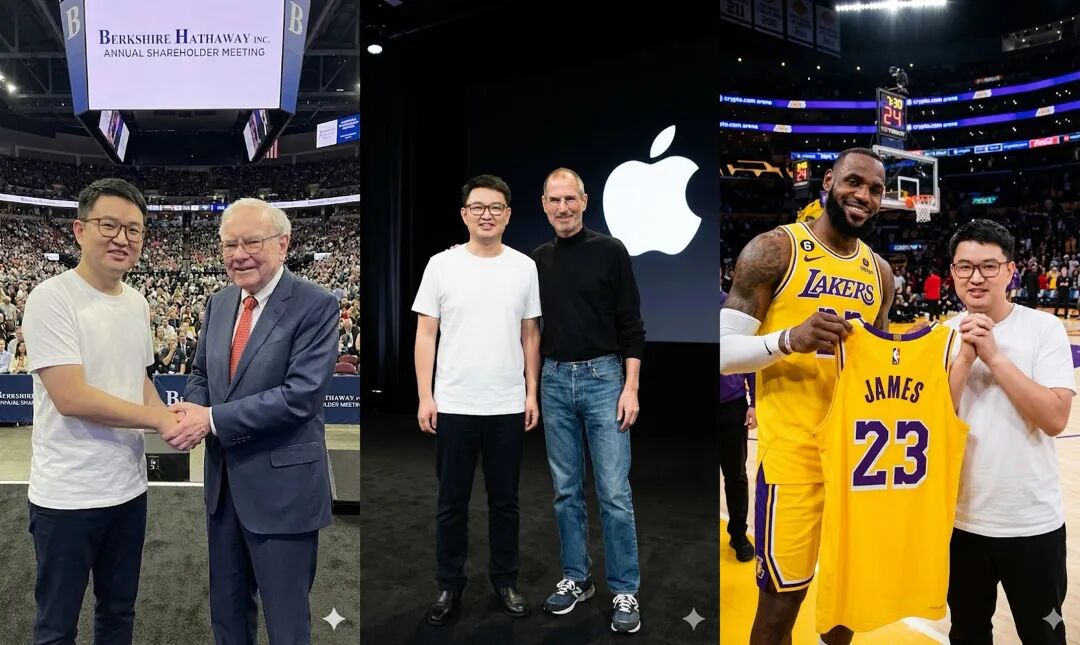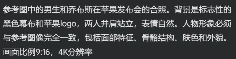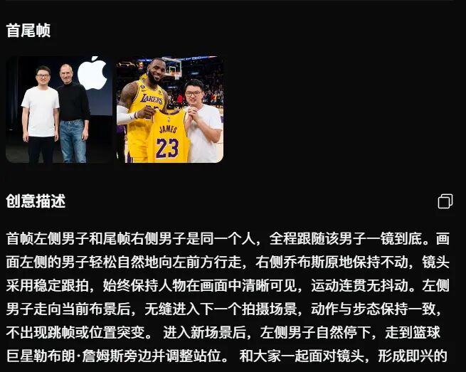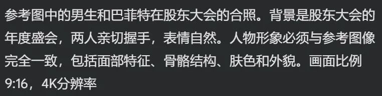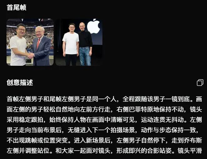 我这里选择的首帧是与巴菲特老爷子的合影,尾帧选择与乔帮主的合影,及对应的提示词如下: