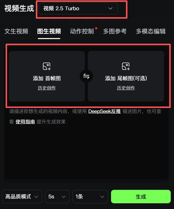 接下来的两个核心点是选择模型及首尾帧添加,我这里选择的是2.5 Turbo,首帧一般选视频开始播放内容,尾帧选视频结束的内容。