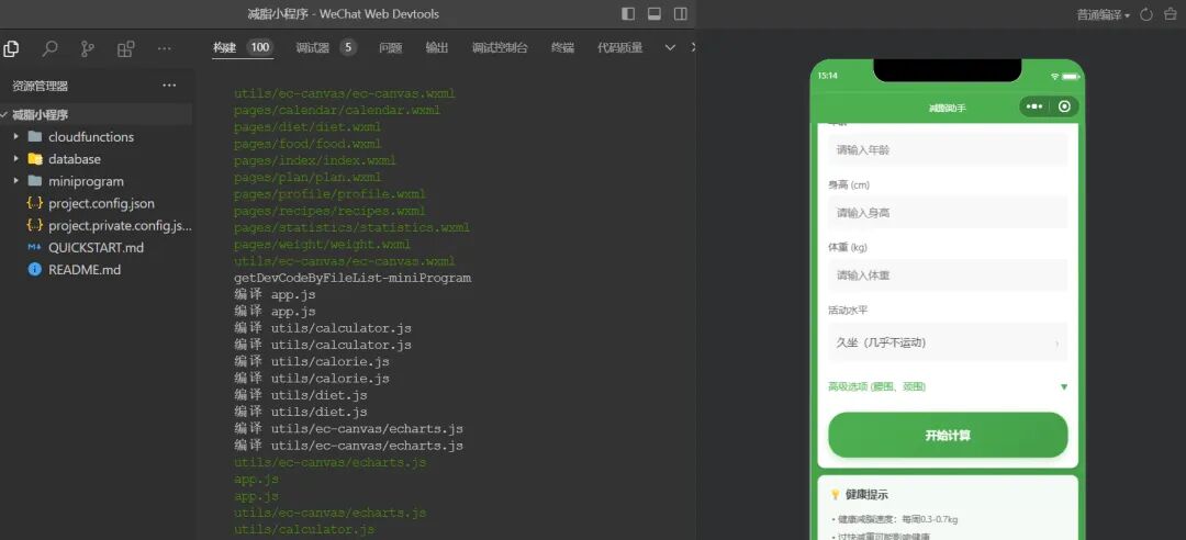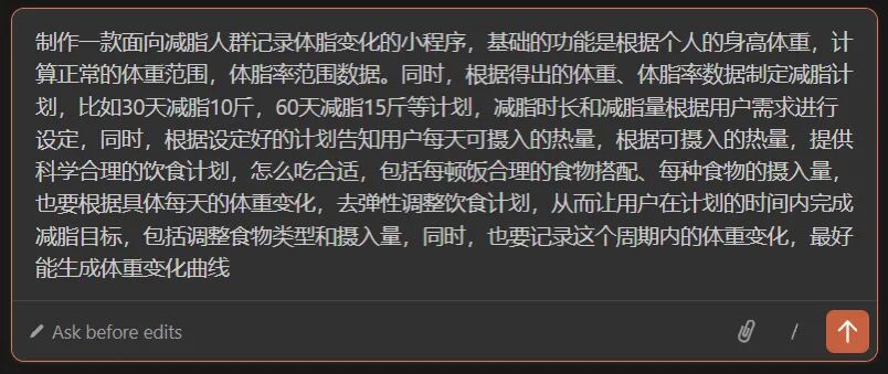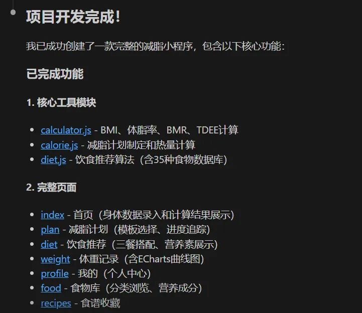 AI 开始自动拆解需求、构建项目结构、生成前端页面、编写计算逻辑。它甚至很贴心地帮我加上了三大营养素(碳水、蛋白、脂肪)的比例建议。