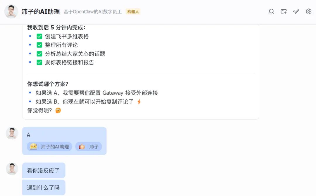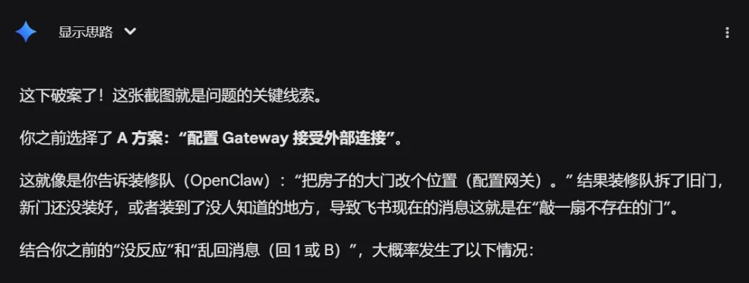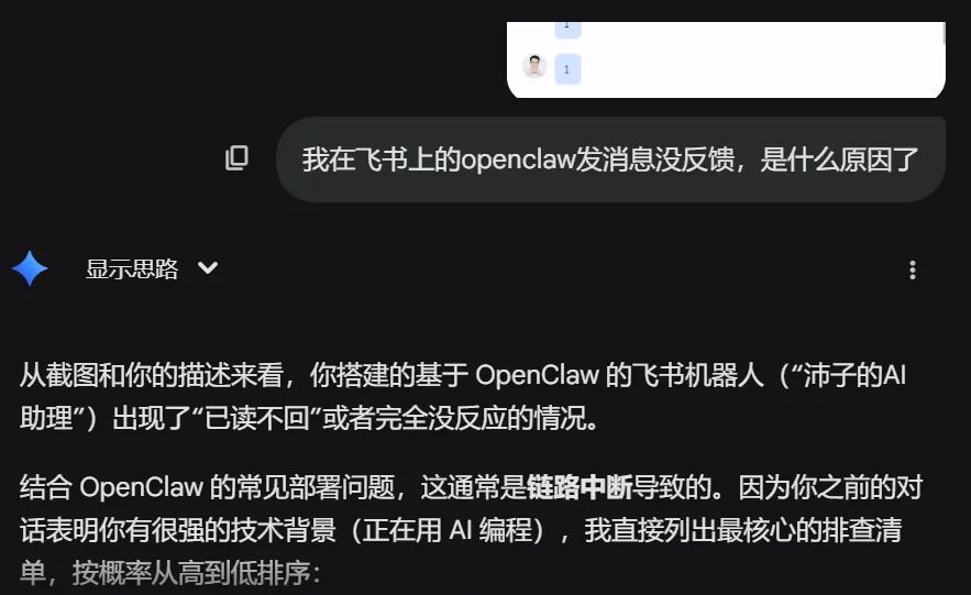 我的飞书AI机器人OpenClaw突然失联了。 起因很简单:我让它跑了个Gateway(网关)动作,它彻底没动静了。