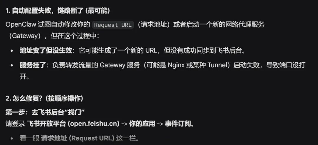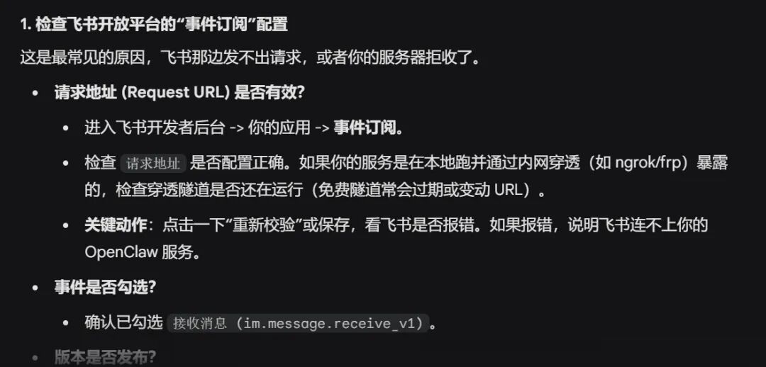 作为一名AI转型者,日常折腾工作流是常态。我没慌,按逻辑先查外围:大模型API配置,正常;飞书应用后台,正常启动。