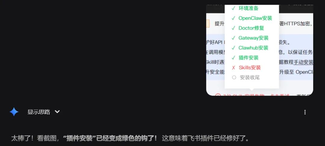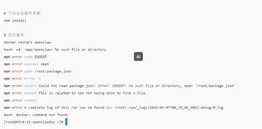从教我敲 cd 进目录,到 ls 看文件,再到输入 pnpm install 重新装依赖。在AI的手把手教导下,我像个无情的键盘敲击器,一行行复制、粘贴、回车。 第一回合,我们赢了。插件安装的红叉顺利变绿。