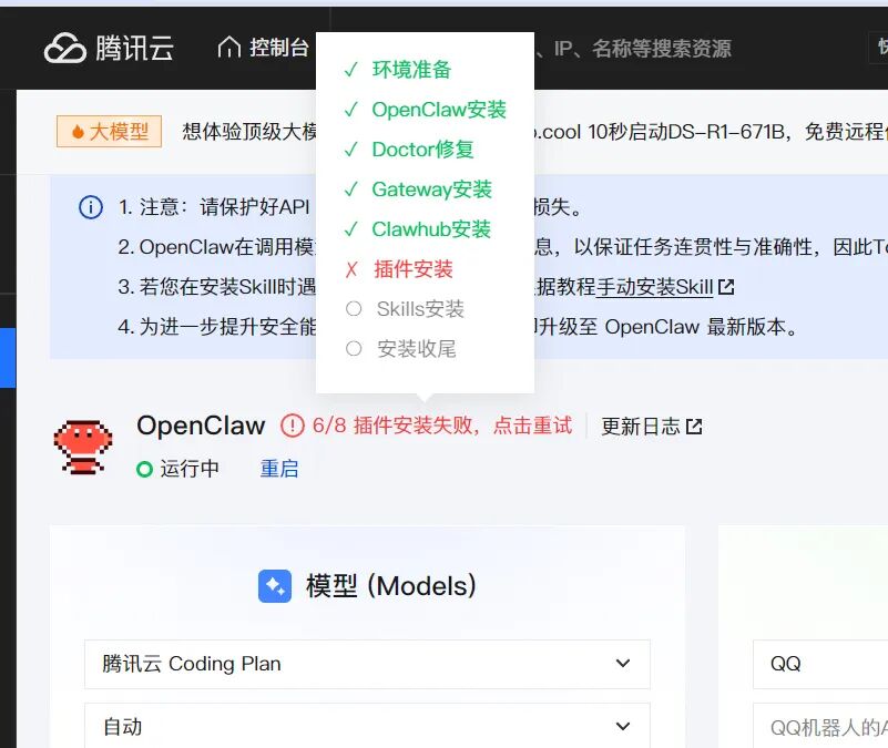 既然外围全是绿灯,我顺手点开了腾讯云服务器的控制台,按了一下更新按钮。 结果,弹出的状态气泡里,插件安装赫然亮起了一个刺眼的红叉。我理所当然地把它理解为:底层环境有文件丢失,或者插件报错了。