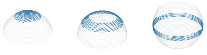 图 3 不同网格点(红色)的注意力窗口(蓝色高亮的网格点)。灰色网格点展示了信息在处理器6层内可以传播的范围示例(AIFS总共有16层处理器)。为了便于说明,图中显示的网格分辨率低于AIFS实际使用的分辨率(论文[2])