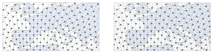 图 2 AIFS编码器(左)和解码器(右)图的示例可视化。ERA5网格点显示为小黑圆点,处理器网格点显示为较大的灰色圆点,边以黑线表示。为了便于观察,仅绘制了地球表面的一小部分区域(论文[2])