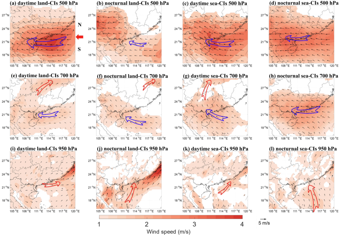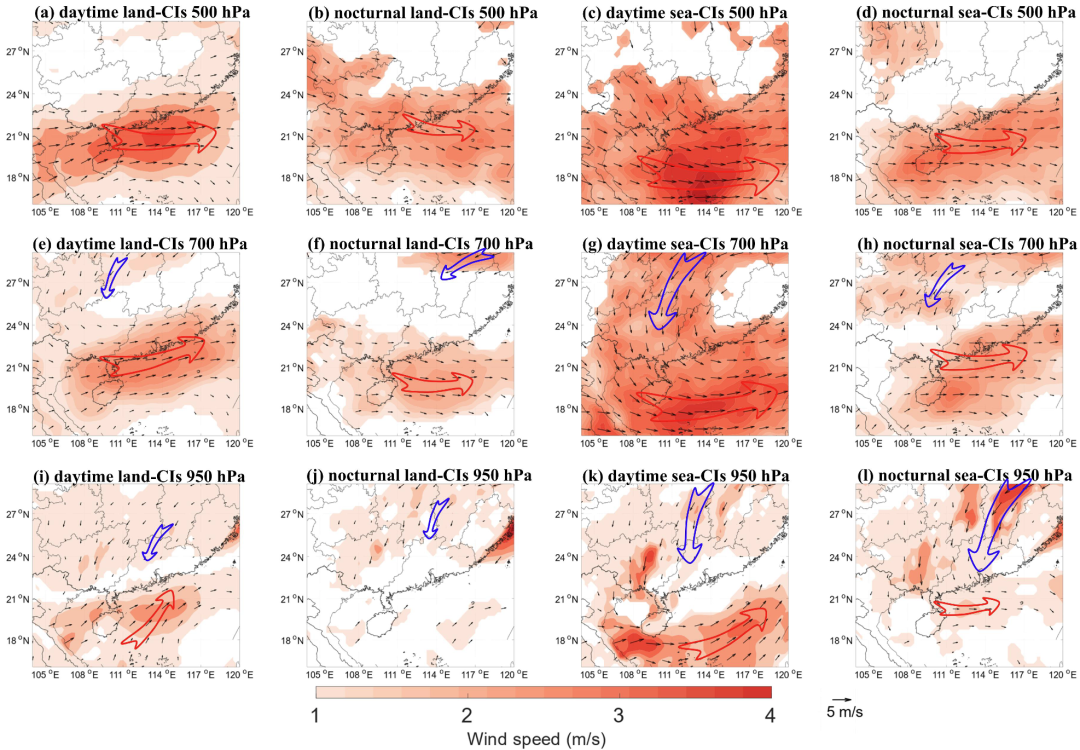 图2 华南沿岸 (a, e, i) 白天陆面、(b, f, j) 夜间陆面、(c, g, j) 白天海面及 (d, h, l) 夜间海面发展为MCS的新生对流对应的500,700和950 hPa风场异常 (相对于华南前汛期气候平均)。