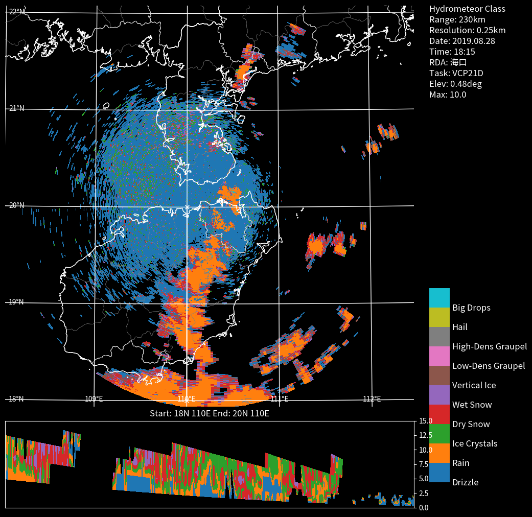 水凝物分类产品(HCL)是双偏振天气雷达的重要衍生产品之一,能够直观展示降水粒子类型(如雨、雪、冰雹等)的空间分布。本文将基于Pythoncinrad库,演示如何从雷达数据中提取HCL产品并绘制垂直剖面图。