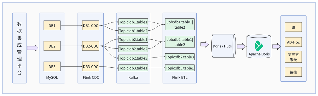 围绕这些目标,团队逐步明确了建设思路:以 Doris 作为实时分析底座,以统一的数据集成管理平台承接实时链路的标准化与自动化能力,完成从数据采集、处理到服务输出的整体升级。