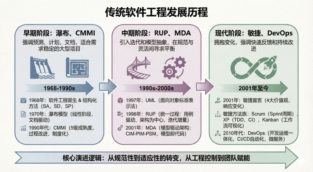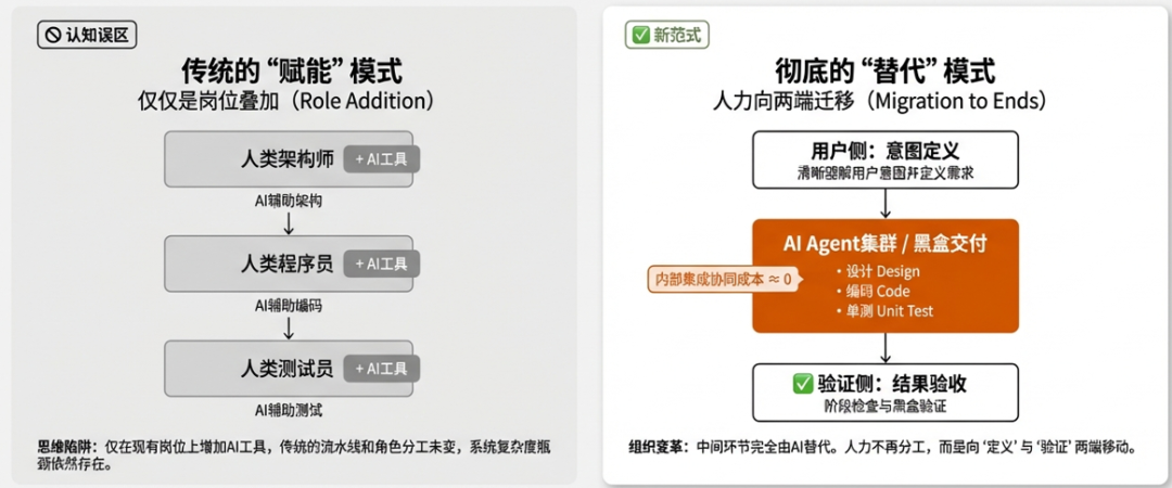 因为很多时候我们仍然是按照传统的软件工程,传统的岗位角色分工,对原有的类似于需求设计前端后端各个岗位进行AI赋能。在这种方式下面,你想通过AI实现成倍的效率提升,基本上是不可能的。包括在昨天我跟朋友沟通的时候,也举了一个例子,就是这种模式好像就是一个老的马车,它装了一个V8的引擎,但是接着跑着跑着就只能是散架。