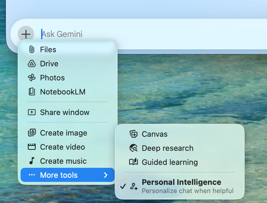 点击「Add files and tools → Share window」,Gemini 就能看到你当前窗口的内容——文档、代码、数据表格都行