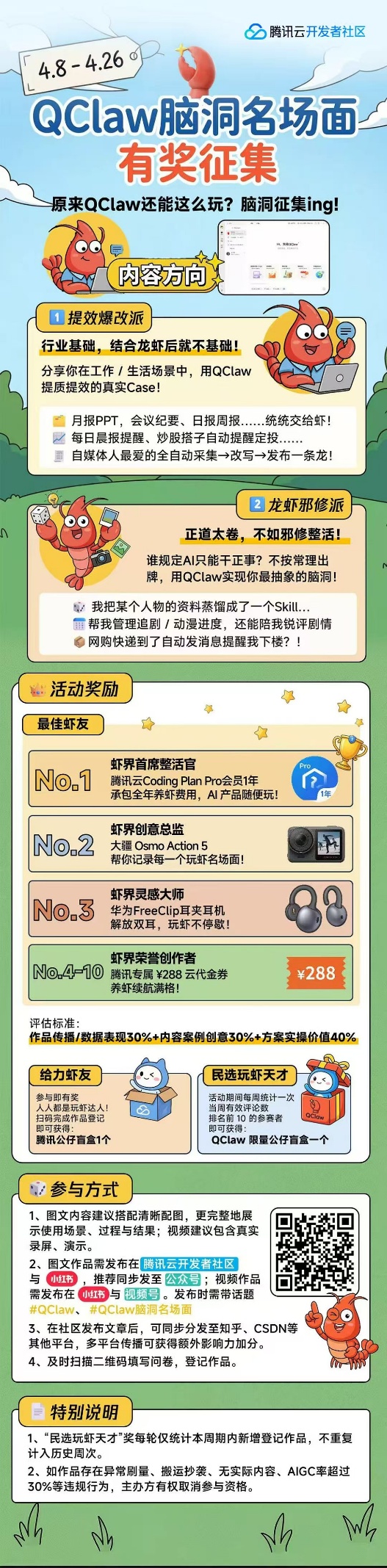 我已经带着我的 “龙虾工作室”,参加了腾讯云开发者社区的 QClaw 脑洞征集活动,如果你也有好玩的用法,或者想看看更多自媒体人的效率玩法,欢迎来一起交流~