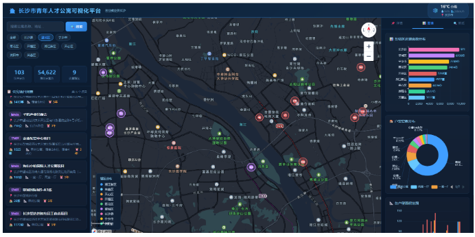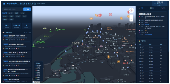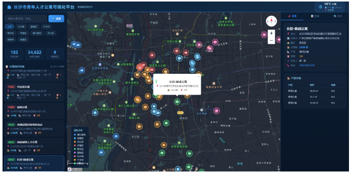 海量公寓房源分布于岳麓、天心、雨花、芙蓉、望城、开福、浏阳、宁乡等各区县及产业园区,传统 Excel 表格、静态图片展示模式存在空间位置不直观、查询效率低、数据联动弱、决策支撑不足等痛点。青年人才难以快速匹配 “区位 — 房源 — 配套”,管理部门也缺乏全局化、可视化的房源监控与规划工具。