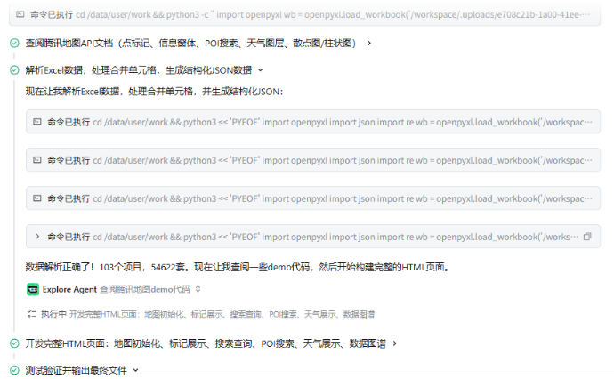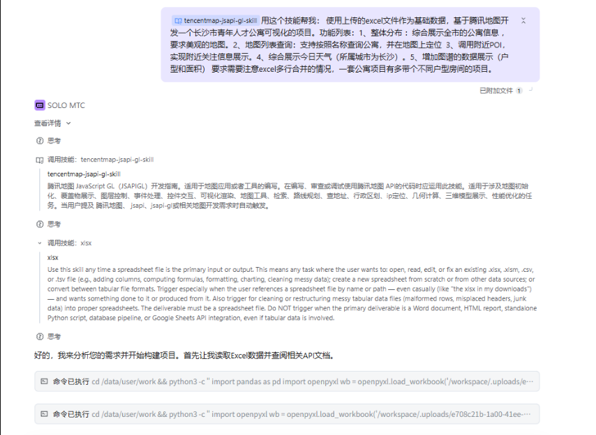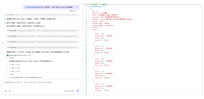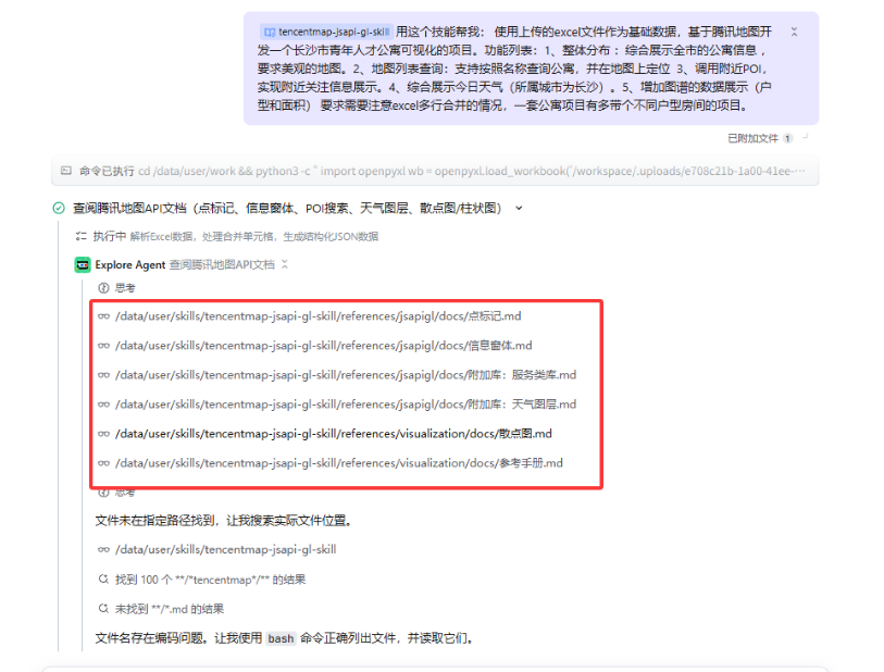 选好趁手的兵器后,接下来就进入实战环节,后续的内容我们大多数都是使用自然语言描述的方式对系统进行交互,让ai调用技能来实现我们的需求。在系统会话界面,首先将我们搜集的人才公寓excel信息上传到系统,然后输入以下提示词: