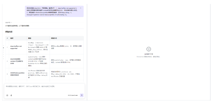 修改生成的index.html,页面报错。错误如下:1、draw buffers not supported 2、自定义信息窗体解析错误: content内容无法被解析为DOM,将自动转为默认样式。 3、类型错误: InfoWindow.position参数类型错误,应为TMap.LatLng。4、Uncaught TypeError: Cannot read properties of null (reading 'x')。