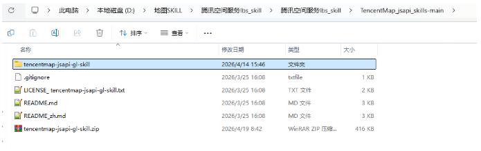 这里我们首先将腾讯地图的地图SKILL下载到本地,将包含SKILL.MD的文件包含依赖的包压缩成一个压缩包。如下所示: