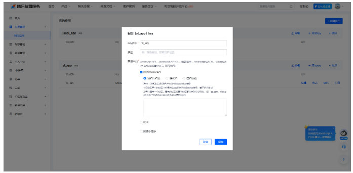 步骤3:创建应用后,点击“添加 Key”,填写 Key 名称、描述,勾选“WebService API”“JavaScript API”(这两个是地图渲染的核心权限,必须勾选),点击“提交”;