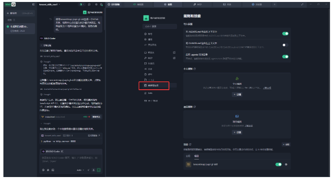 步骤2:在Trae中配置引入Skill,打开Trae的设置页面,找到规则和技能,如下图: