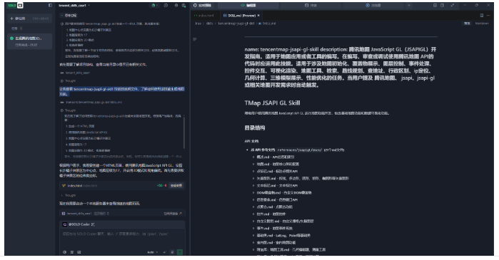 让我先查看当前目录的结构:紧接着可以看到Trae在本地项目中查阅技能信息,让我查看 tencentmap-jsapi-gl-skill 技能的说明文件,了解如何使用该技能生成地图页面。