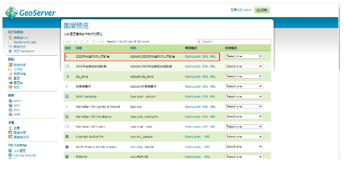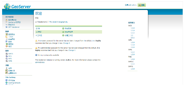 关于GeoServer的相关知识,这里不赘述,以后可以专门花一些时间来讲解GeoServer的知识以及如何进行二次开发。这里仅简单讲解GeoServer中服务的发布已经如何进行服务的调试预览。把本地的GeoServer服务启动后,在其管理页面中可以看到。