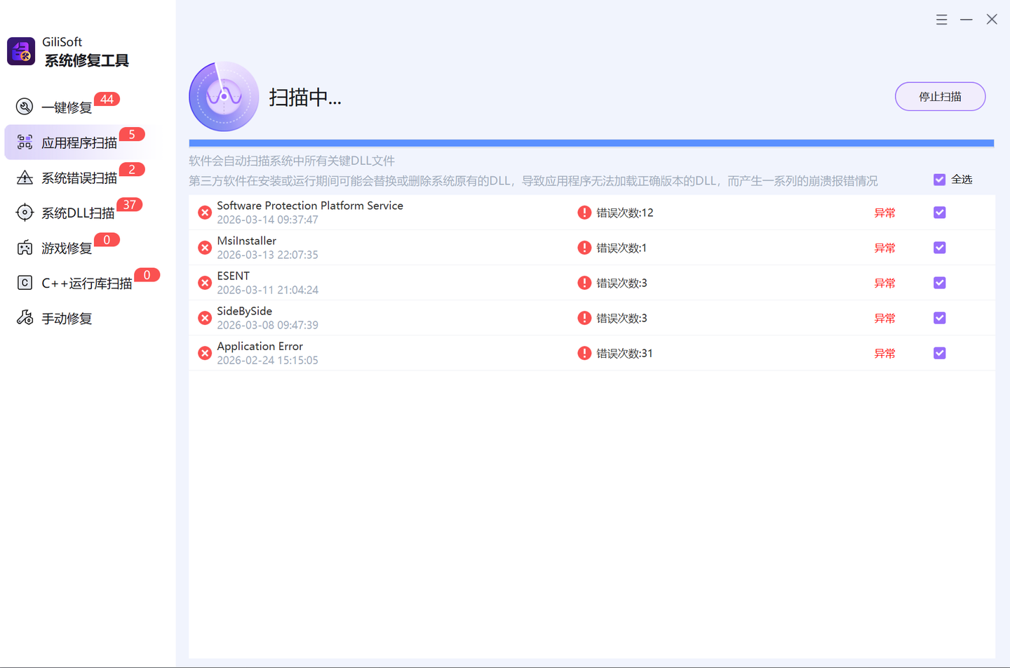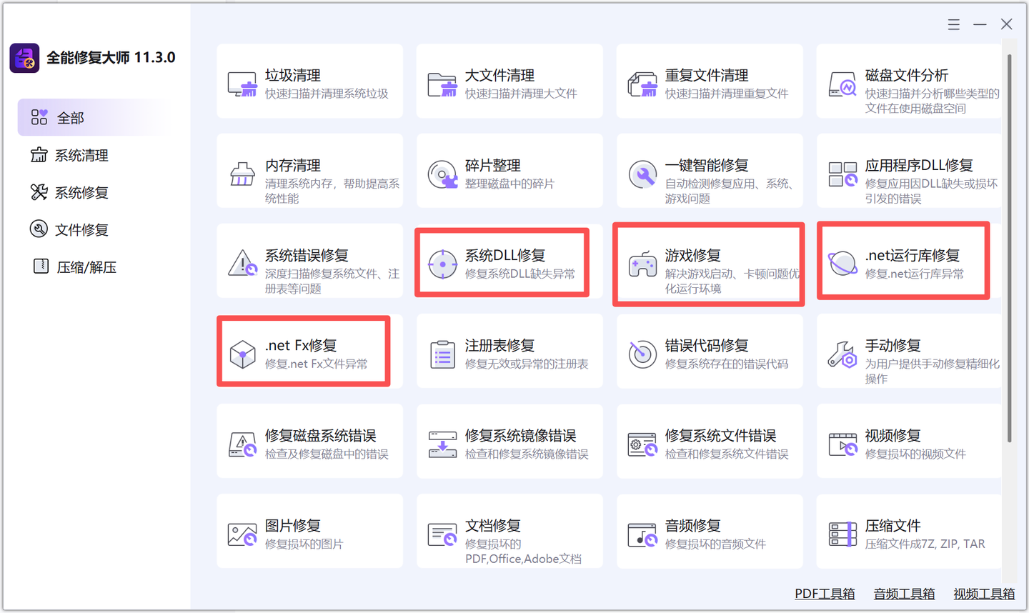 该软件主要有大量的修复功能包括系统DLL修复,游戏修复,.net运行库修复,.et Fx修复等。