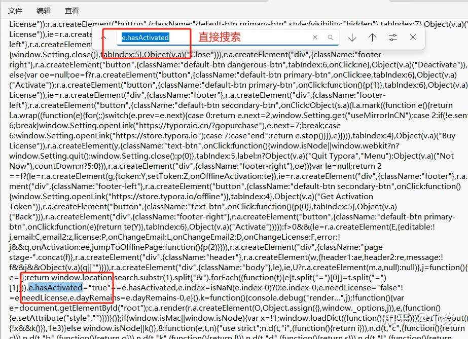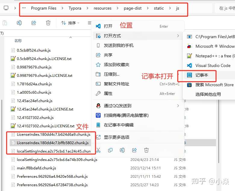C:\Program Files\Typora\resources\page-dist\static\js\LicenseIndex.180dd4c7.bffb5802.chunk.js如下图,使用记录本(也可以使用其他编辑软件,不一定要记事本)打开并修改(如果不能修改,记的以管理员身份运行):