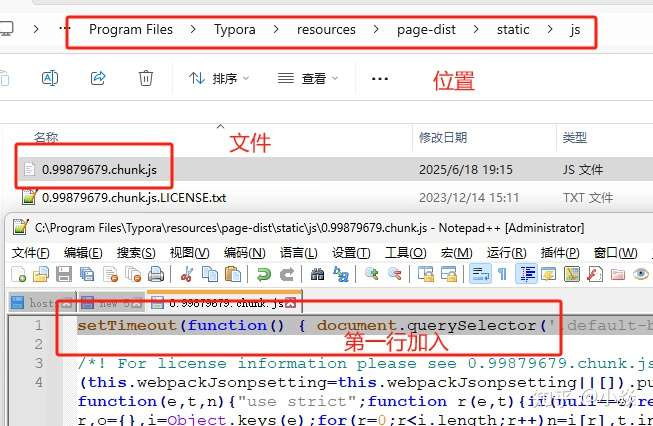 C:\Program Files\Typora\resources\page-dist\static\js\0.99879679.chunk.js这次我选择以nodepad++修改内容;并在第一行加入以下内容: