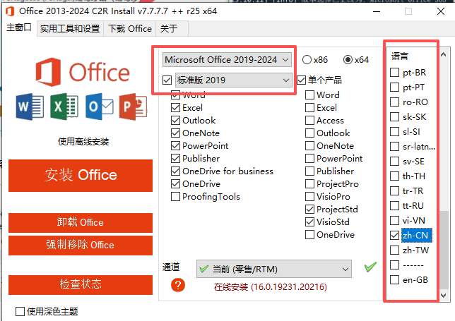 4.在office版本选项中选择你需要安装的office版本,我这里专业增强版2021VL为例(这里可以选择版本,语言,按自己需求选择),如图