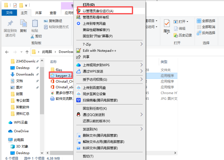 1.返回到解压打开文件夹那一步。找到“keygen.exe",右键管理员身份运行,如图