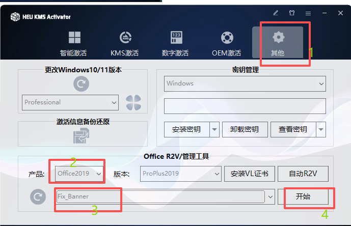 1.点击【其他】按钮-产品选择【Office2019】-选择【Fix_Banner】-点击【开始】按钮