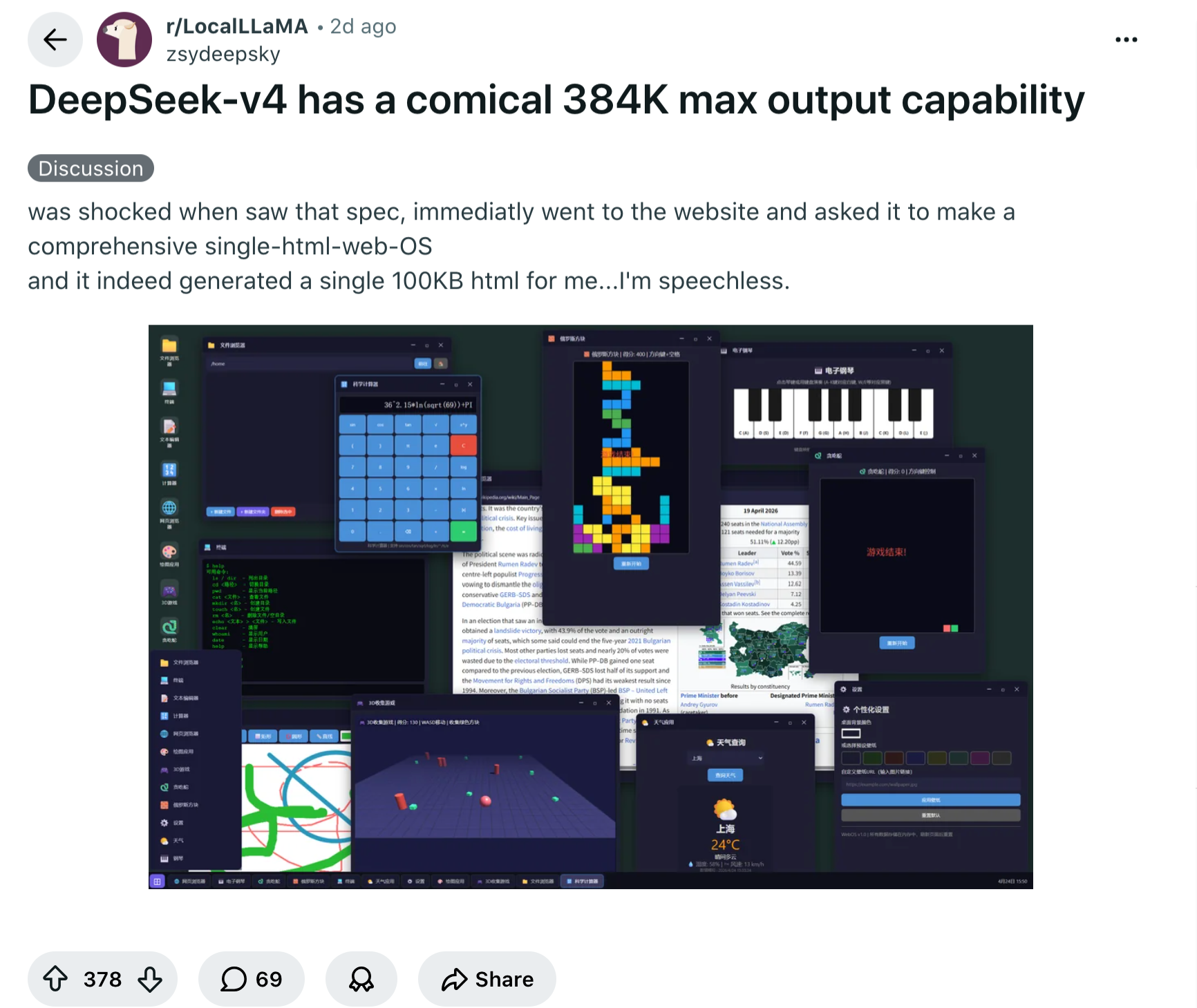 当用户要求DeepSeek-V4编写具有交互界面的数据仪表盘或商业着陆页时,其输出的HTML、CSS与React组件代码在语法上是正确的,交互逻辑也顺畅运行(甚至能在单次生成一个体积达100KB的单文件网页级操作系统原型),但渲染出的页面在结构感、间距、视觉层次与排版美学方面相对不足。