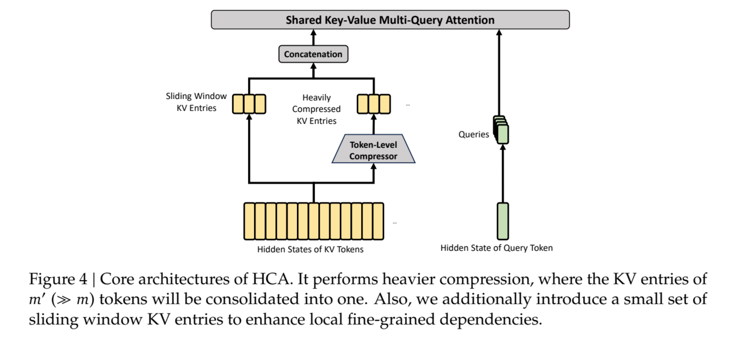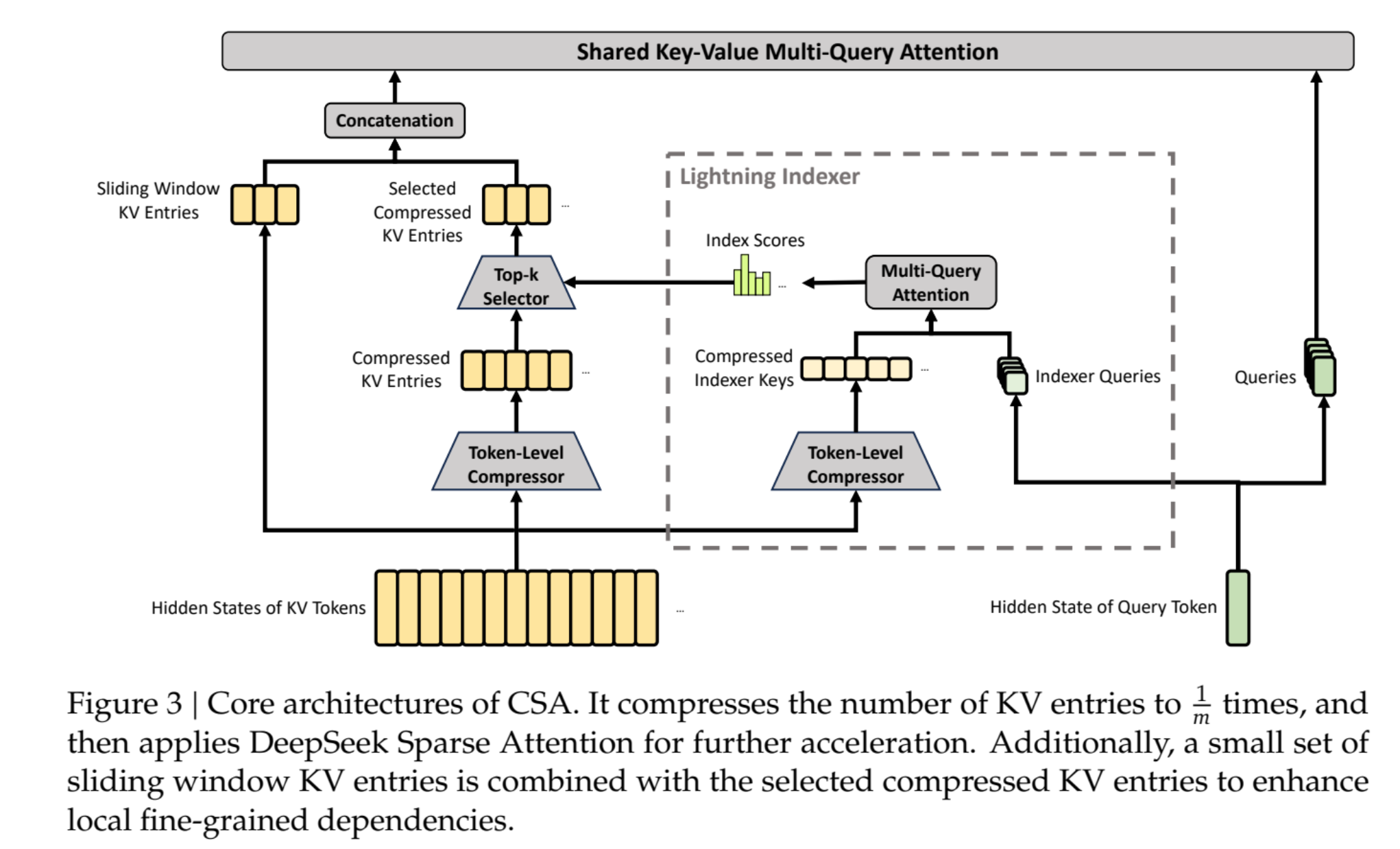 在处理高达1M Token的超长上下文时,传统的Transformer架构面临键值缓存(KV Cache)随上下文长度增加而呈线性甚至超线性增长的显存占用问题。DeepSeek-V4引入了一种混合注意力架构,该架构交织了压缩稀疏注意力(Compressed Sparse Attention, CSA)、深度求索稀疏注意力(DeepSeek Sparse Attention, DSA)以及重度压缩注意力(Heavily Compressed Attention, HCA)。