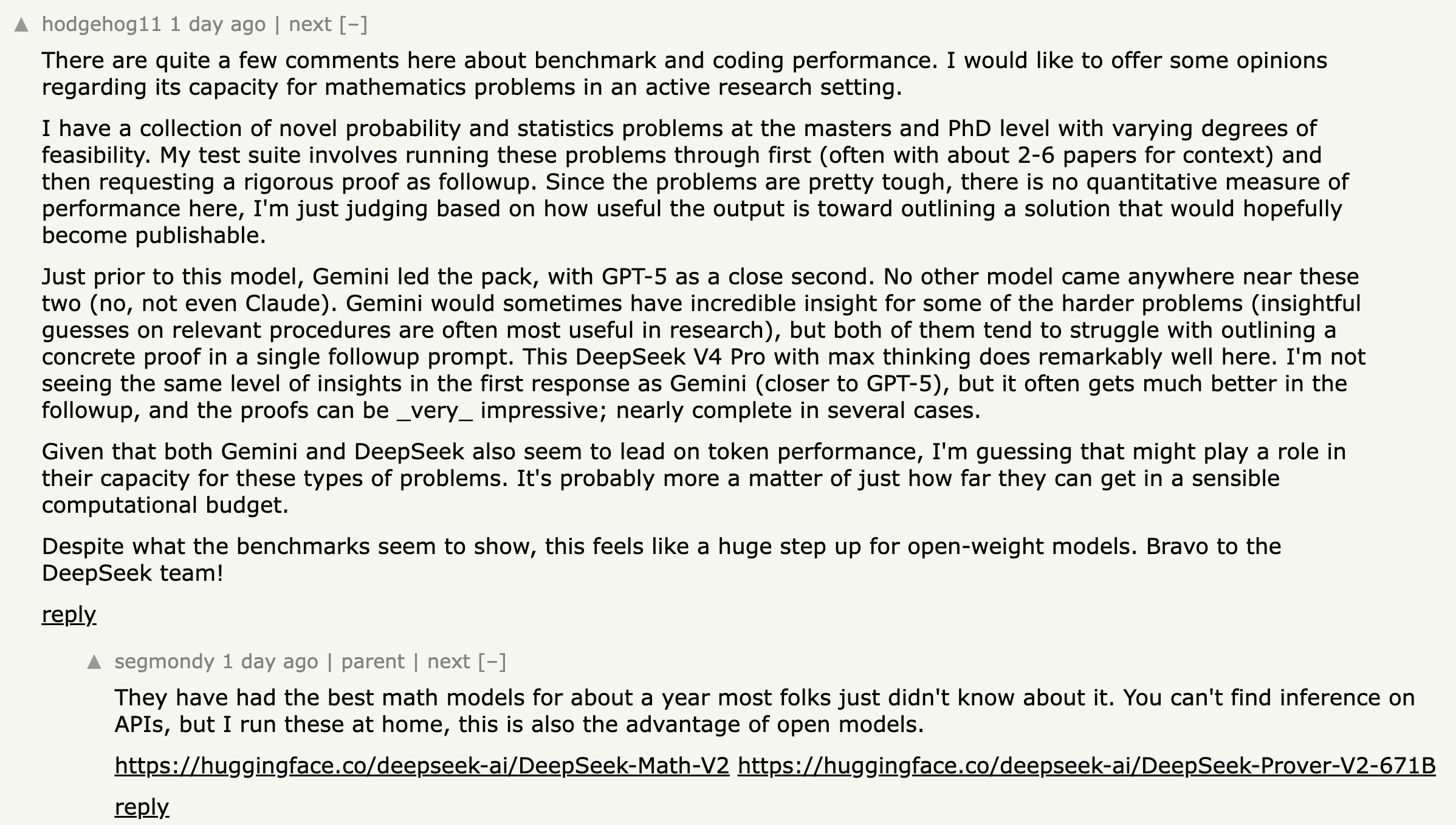 在要求严密性的高等数学与统计概率学领域,DeepSeek-V4-Pro开启Think Max模式后的表现受到关注。一位在Hacker News上发布测试记录的数学博士研究员分享了对模型进行的“盲测”。该研究员建立了一个包含仅存于顶刊论文中、尚未被互联网大规模收录的概率学难题的测试库。测试流程要求模型在阅读2至6篇专业参考文献后,给出后续证明方案。