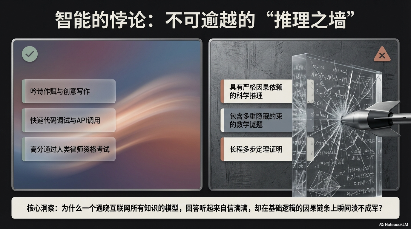 这说明什么?说明即使模型越来越大,通用知识越来越丰富,它们做严格逻辑推理的能力并没有跟着提升。甚至在某种程度上,因为太会“说话”了,它们反而更擅长用漂亮的语言来掩盖逻辑缺陷。