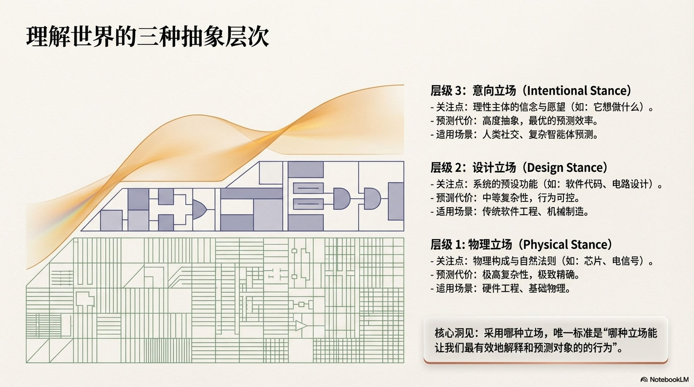 人类在理解和预测一个对象的行为时,会根据需要选择三种不同的“立场”或抽象层次: