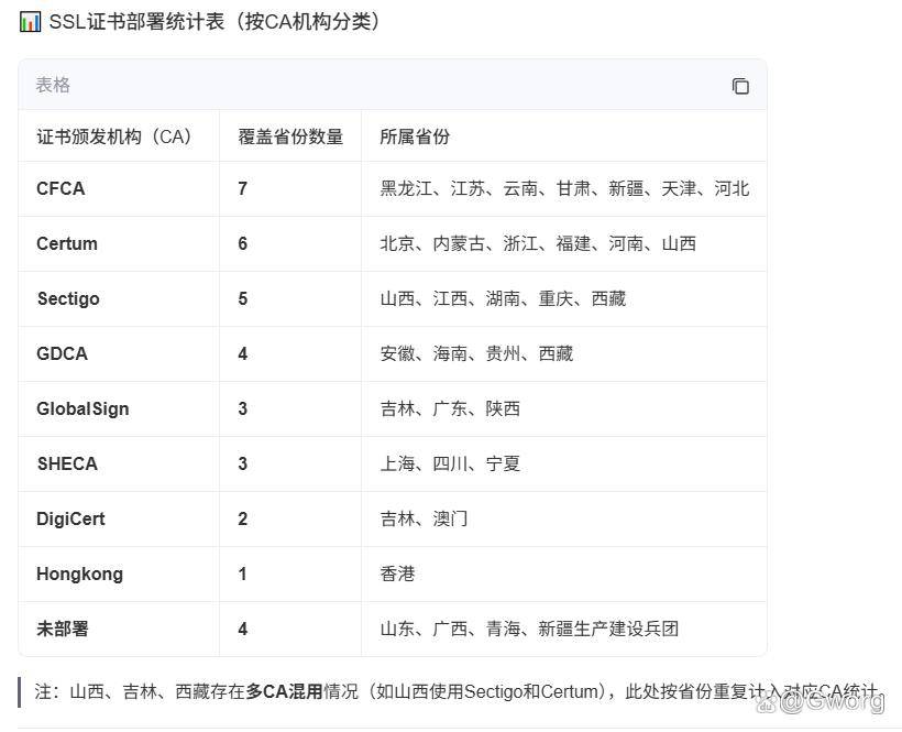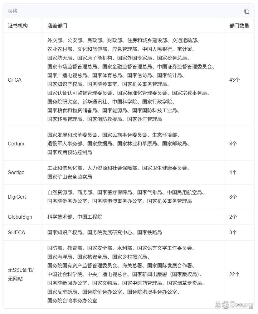 国外SSL证书:Certum(8个)、Sectigo(4个)、DigiCert(8个)、GlobalSign(2个),合计22个部门,占比约22%