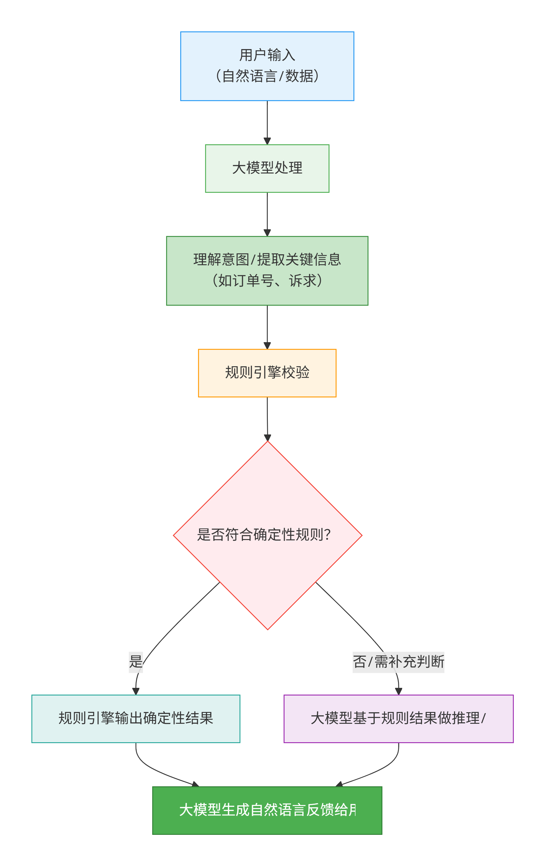 智能客服 | 订单校验、敏感词过滤、合规判断 | 理解用户意图、生成自然语言回复 |
