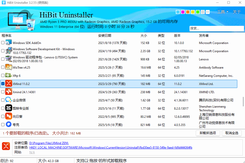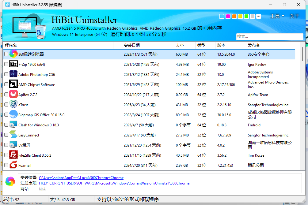 软件列表支持按名称、大小、安装日期排序,还可以快速搜索定位,管理几十上百个软件也不乱。
