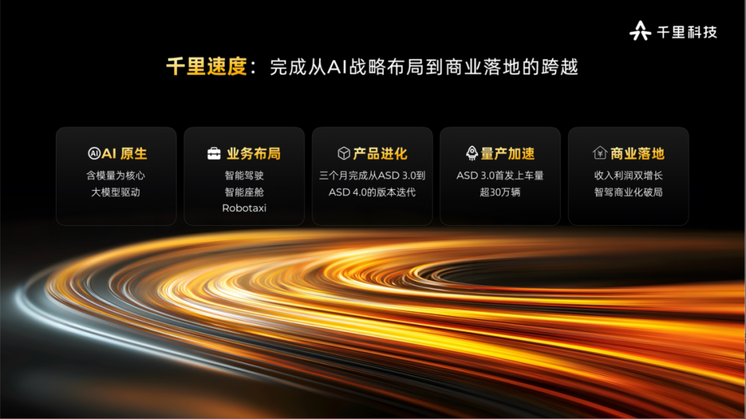 作为聚焦“AI+车”赛道的核心玩家,千里科技的快速成长有目共睹,其发展速度远超行业预期。从战略布局到产品落地,千里科技始终保持高效推进,从大模型布局到智能驾驶、智能座舱、Robotaxi等全产业链布局,构建起完整的“AI+车”生态体系。