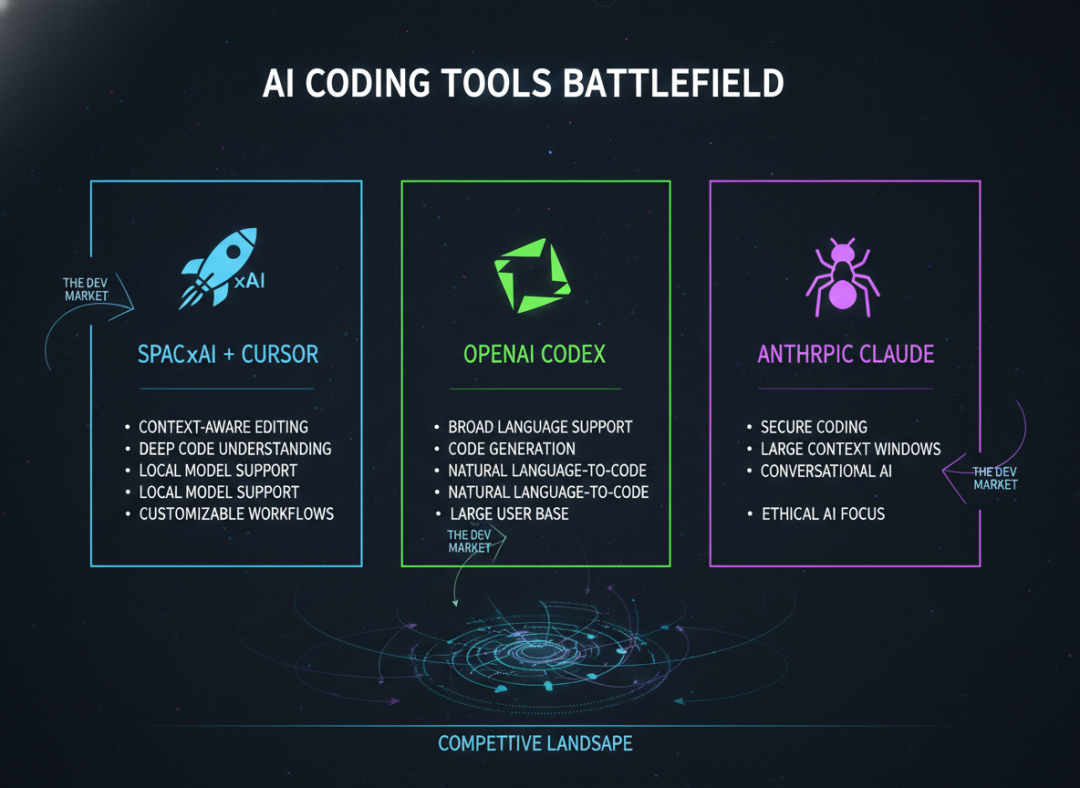 OpenAI Codex:OpenAI 自研的编程模型,已内置于 ChatGPT Anthropic Claude:在代码理解和生成上表现强劲,Cursor 目前仍在使用 Claude 模型 GitHub Copilot:微软旗下,市场占有率最高 Cursor (SpaceX):新兴挑战者,用户体验激进创新