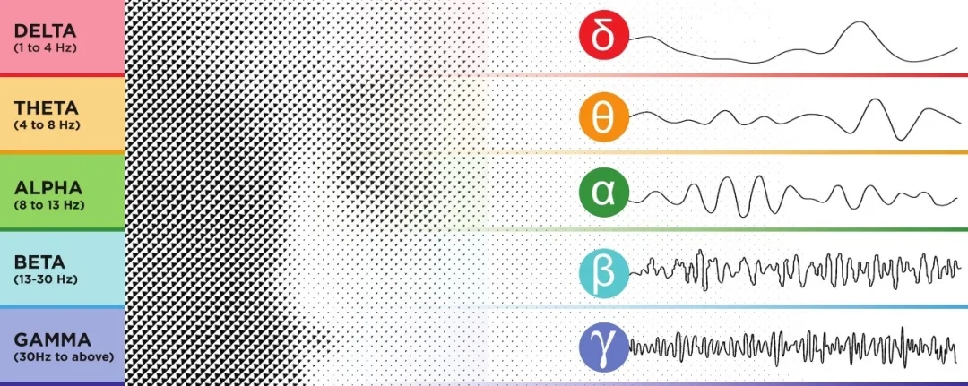 图中为脑波从红色的β波逐渐转为绿色α波和蓝色的θ波